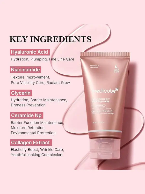 Wake up to glowing, hydrated skin with the medicube - Overnight Collagen Mask, a transformative overnight treatment designed to lock in moisture and improve skin elasticity as you sleep. Enriched with Ceramide NP, Collagen Extract, and Adenosine, this mask delivers intense hydration, strengthens your skin barrier, and enhances elasticity for a firmer, more youthful appearance. Clinically proven to show visible results in just two weeks, it’s perfect for dry, tired, and sensitive skin, leaving your complexion smooth, radiant, and refreshed by morning.
